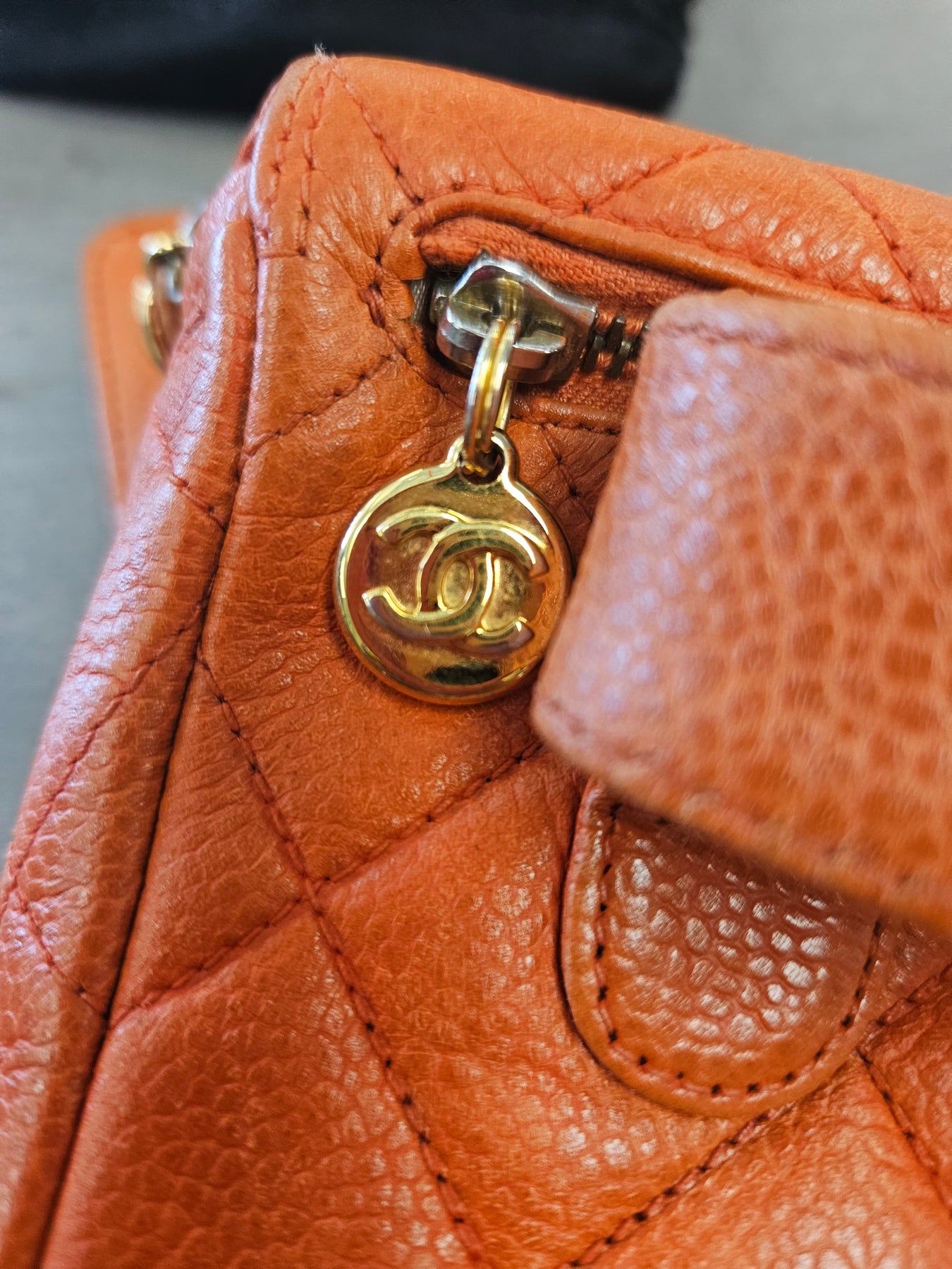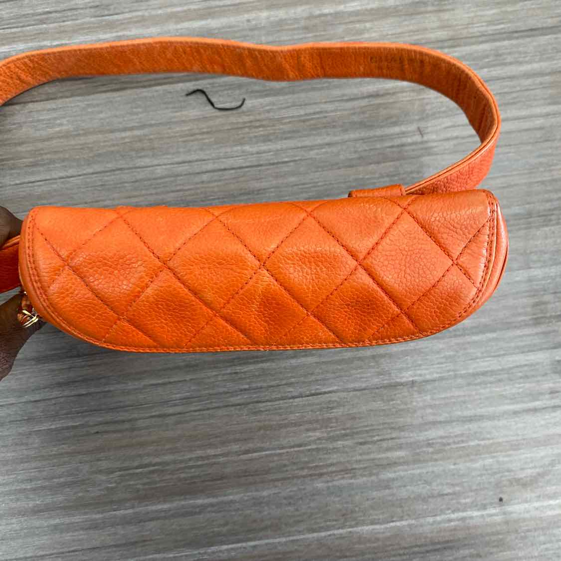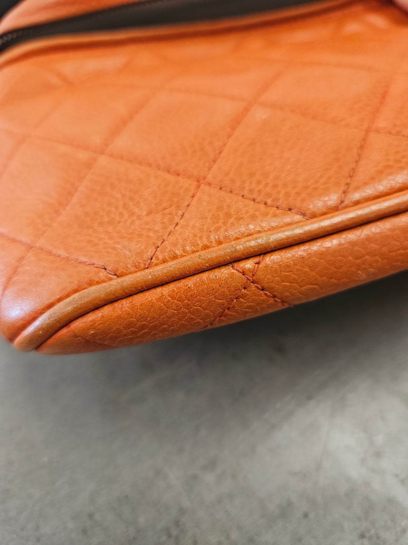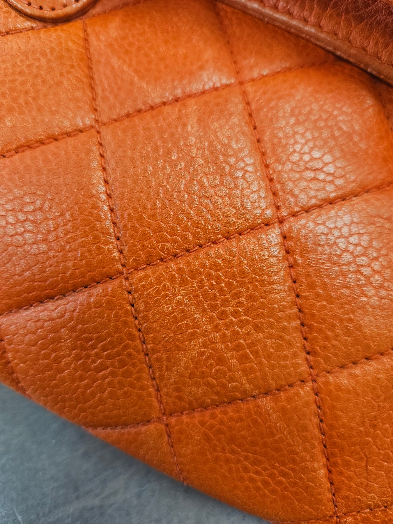 The compact silhouette keeps essentials secure while elevating your look. The durable caviar leather, with its signature quilted detailing, offers a refined texture that wears beautifully over time. Wear it cinched at the waist for a modern belt bag silhouette, or sling it crossbody for a casual, elegant vibe. The bold orange hue adds a playful yet sophisticated edge that pairs with denim, neutrals, or a little black dress, inviting compliments wherever you go. Your valuables stay protected behind a secure zip closure, and the piece arrives in its dust bag as part of careful vintage authentication practices.