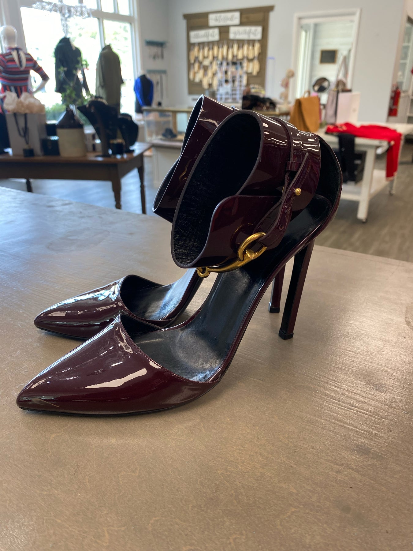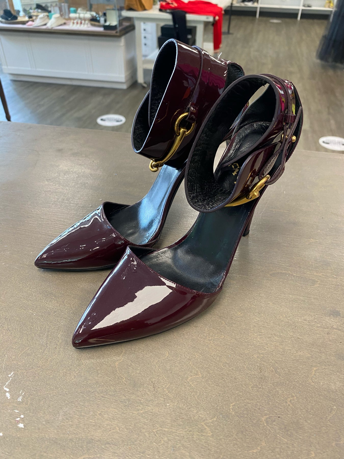 Gucci Wine Patent Leather Ursula Ankle Strap Pumps - Size