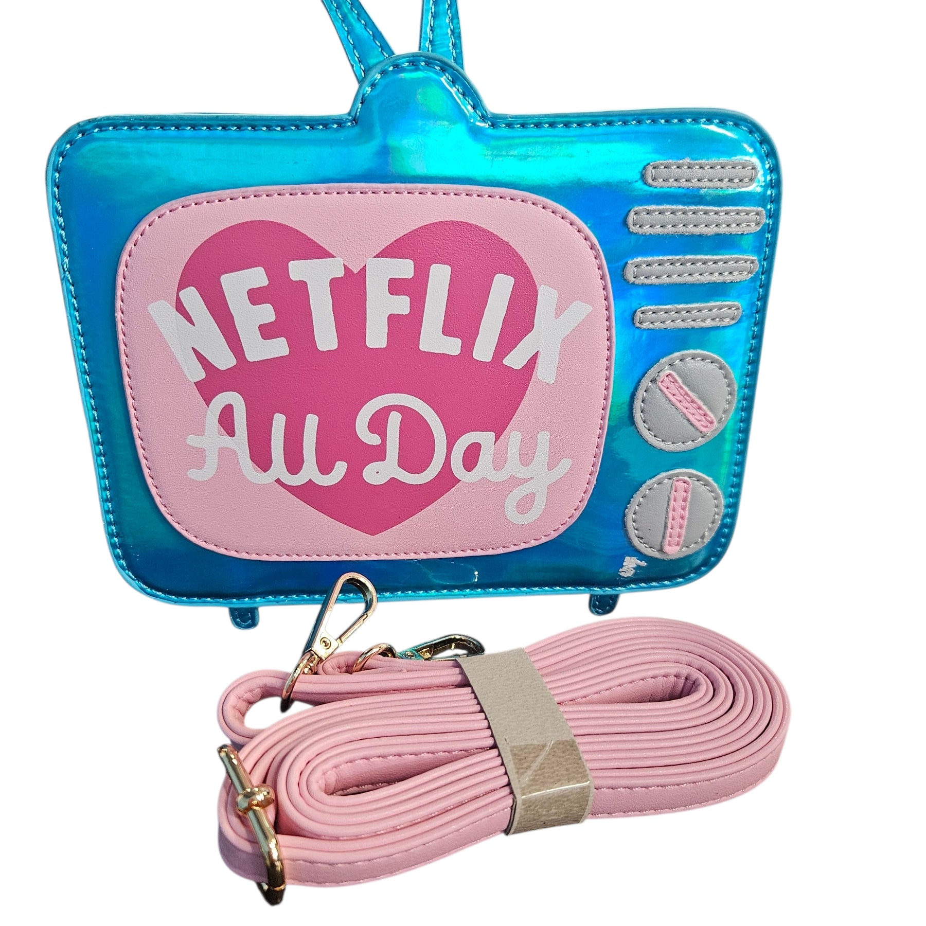 Bewaltz Blue/Pink Shoulder is a compact Netflix-inspired handbag designed for women who enjoy playful, on-trend accessories. It features a blue and pink exterior, measures 7.50" L x 2.50" W x 7.50" H, and remains in never-worn, very good condition with a small front nick for character.