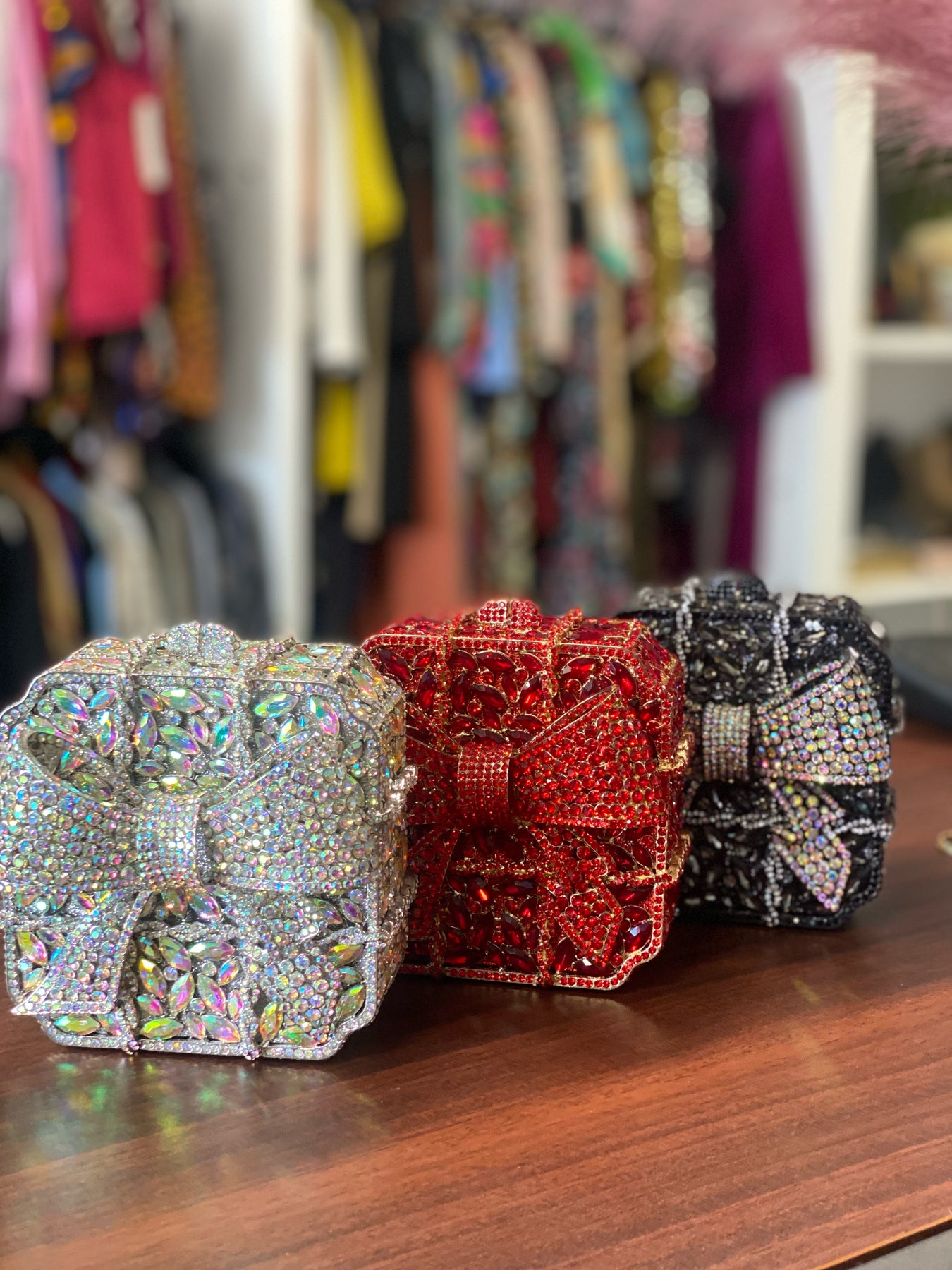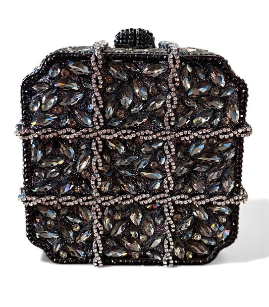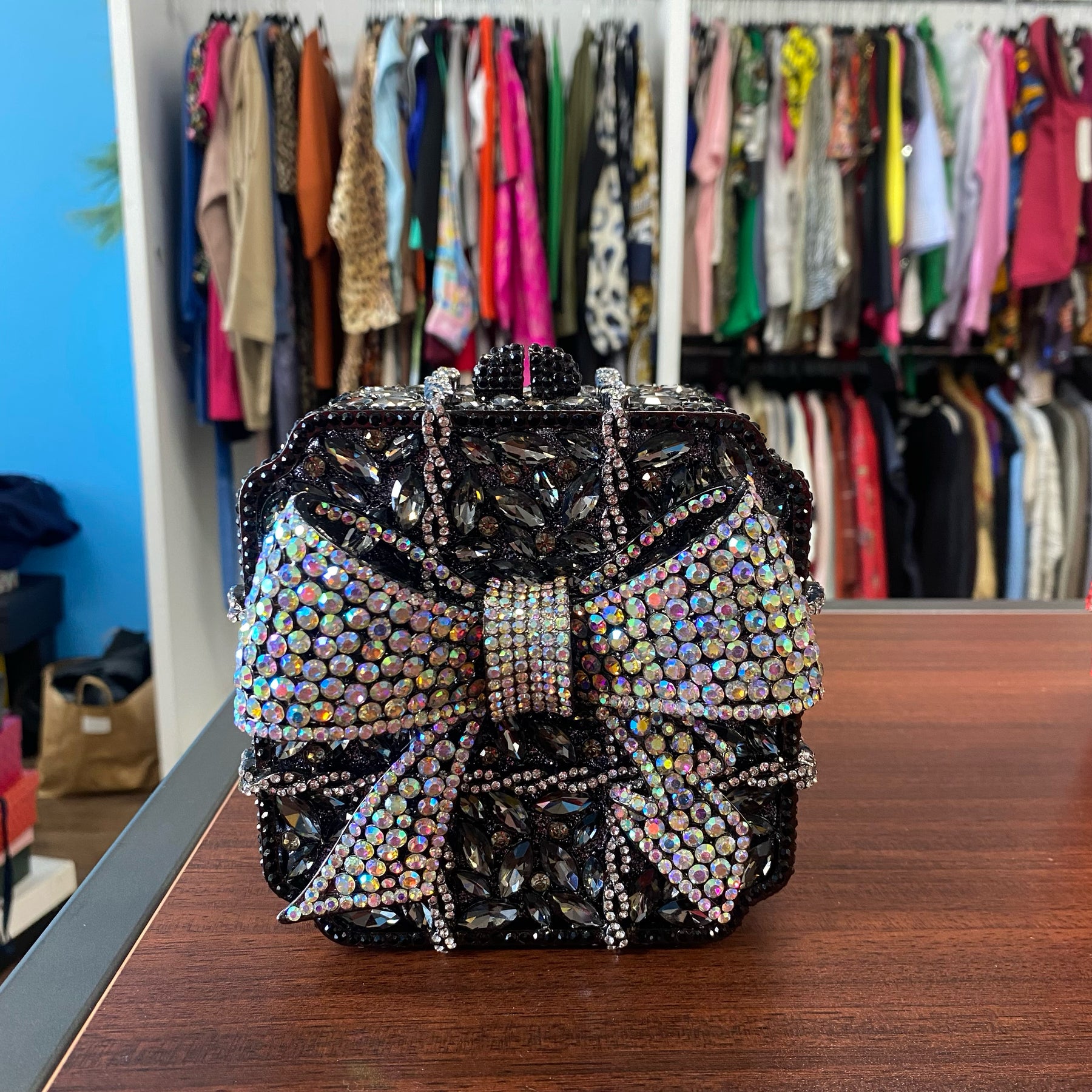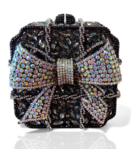 Swarovski Crystal Square Box Bow Black Evening Bag 5" H x 5" W x 2 3/8" D | Strap Drop: 10"