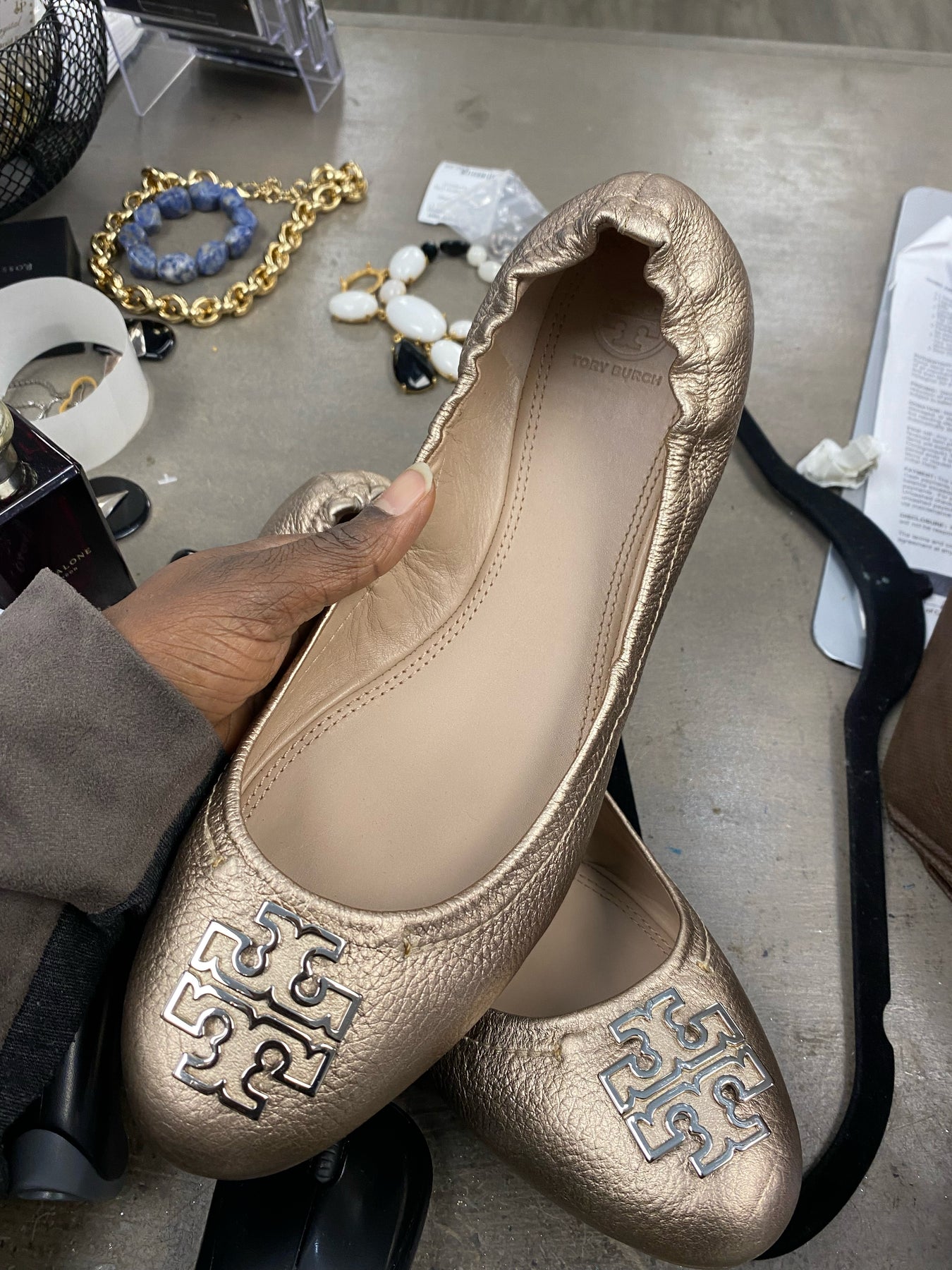 These flats are crafted in genuine leather with a rich metallic finish that catches the light and elevates outfits with minimal effort. The signature Tory Burch hardware at the toe adds a refined focal point, while the rounded toe and low profile keep the look timeless. With wear noted as good, they’re ready to complement denim, dresses, and tailored pieces alike, dressing up looks without sacrificing comfort.