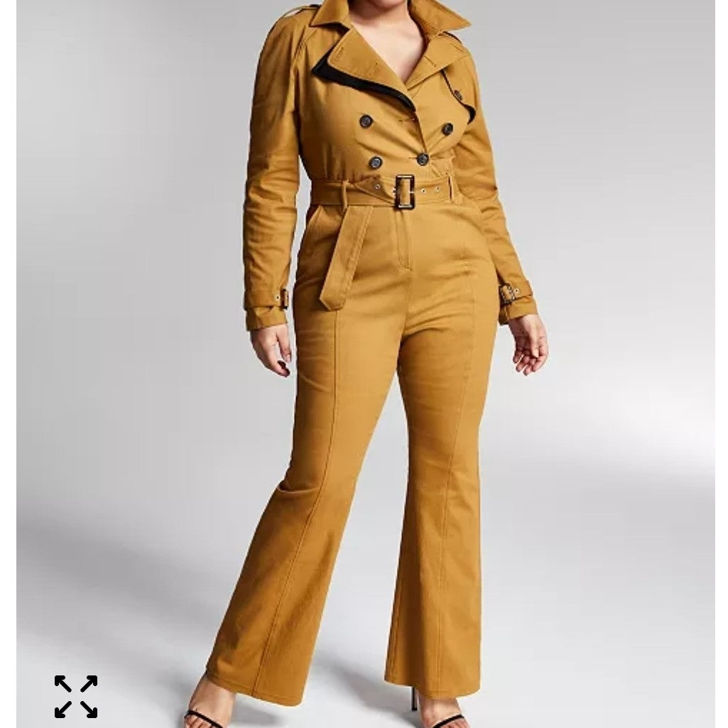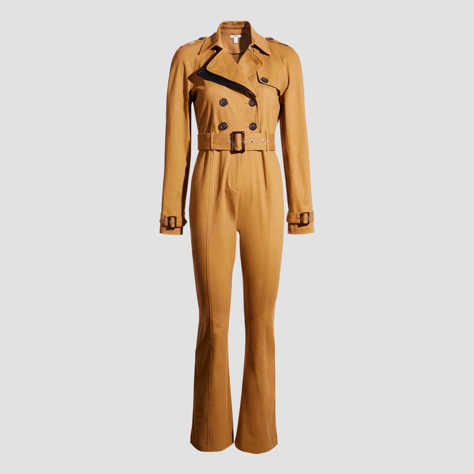- Construction: Trench-inspired jumpsuit with a double-breasted front and lapel collar