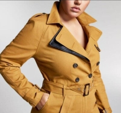 - Details: Belted cuffs with buckle and shoulder-style accents echoing a classic trench