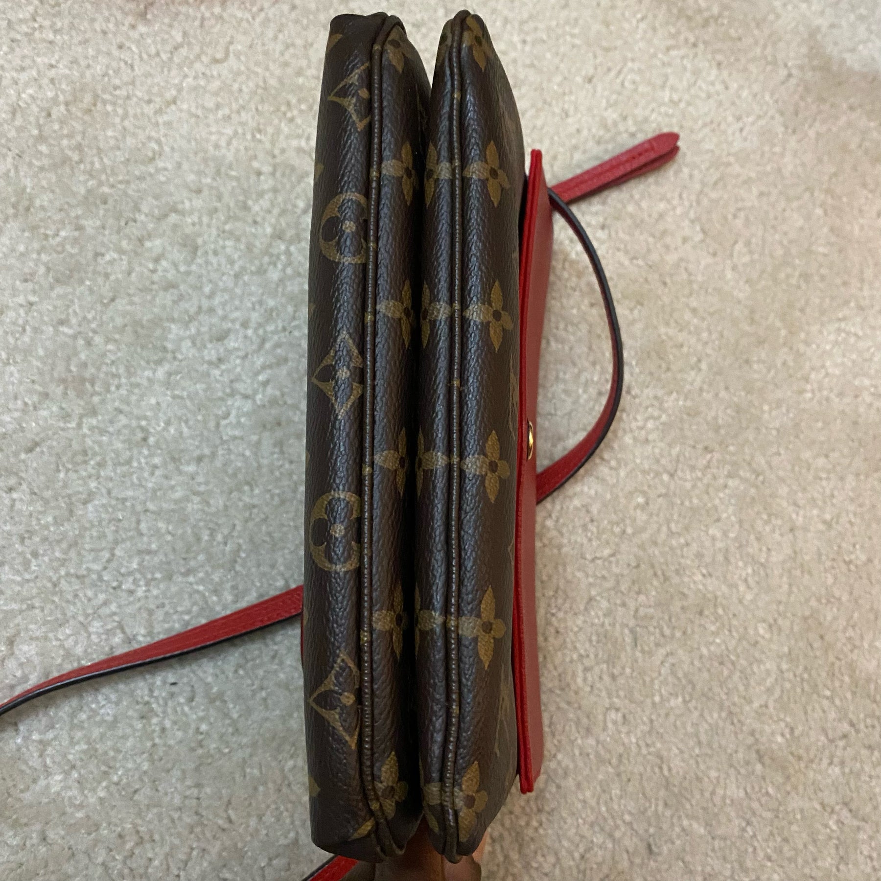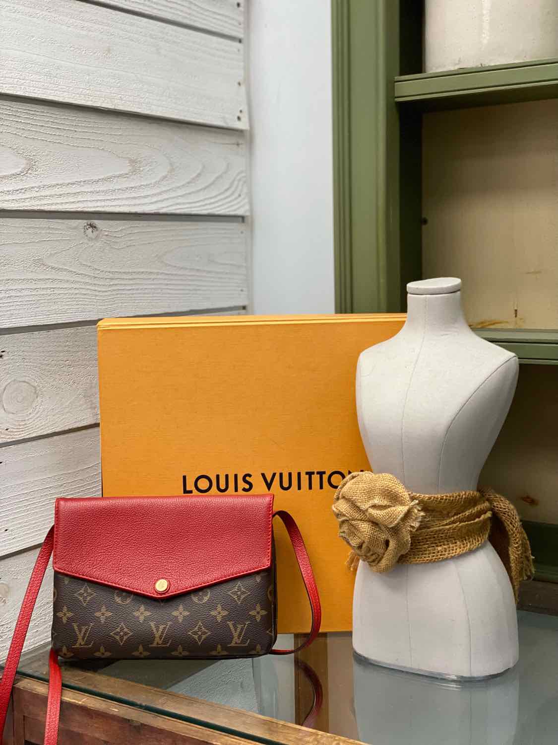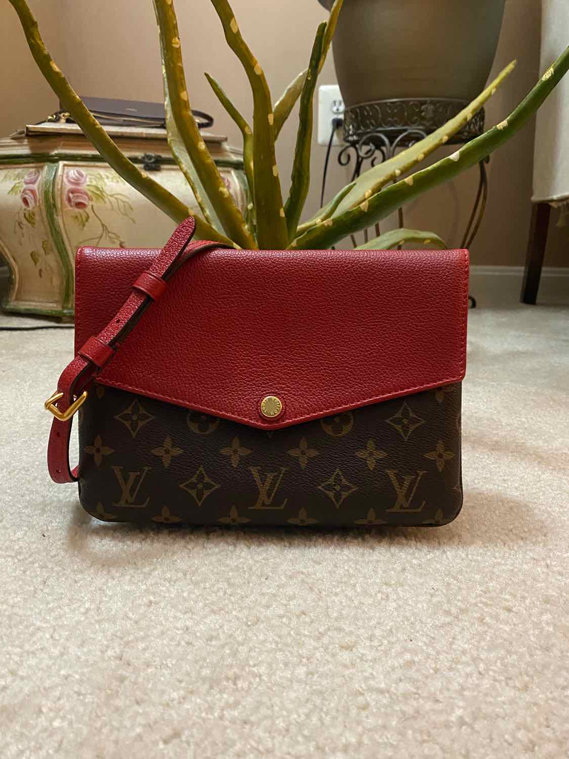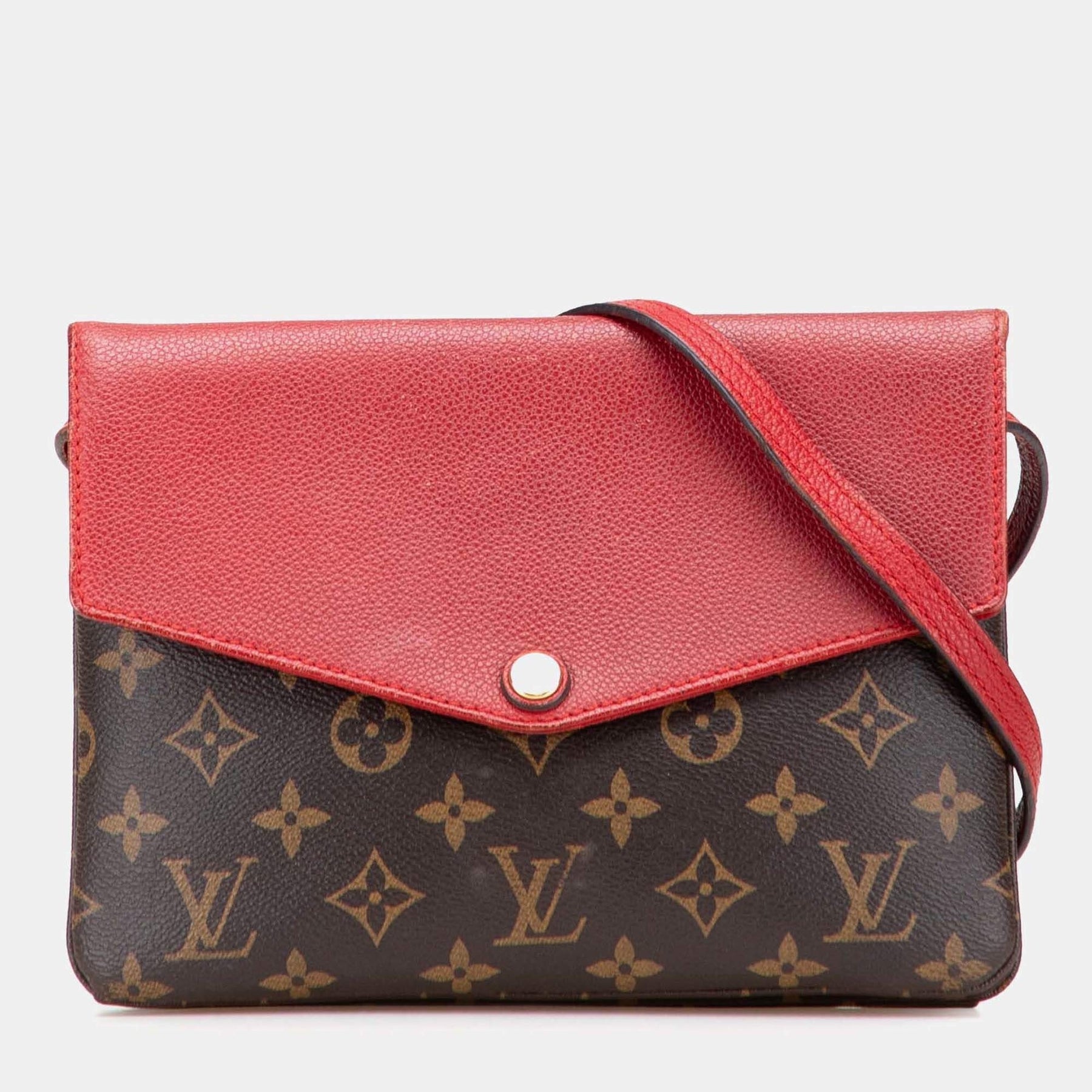 Louis Vuitton Twice Monogram Crossbody Messenger in Brown/Red Leather Canvas is a timeless, compact crossbody designed for women who value subtle luxury and versatile everyday wear.