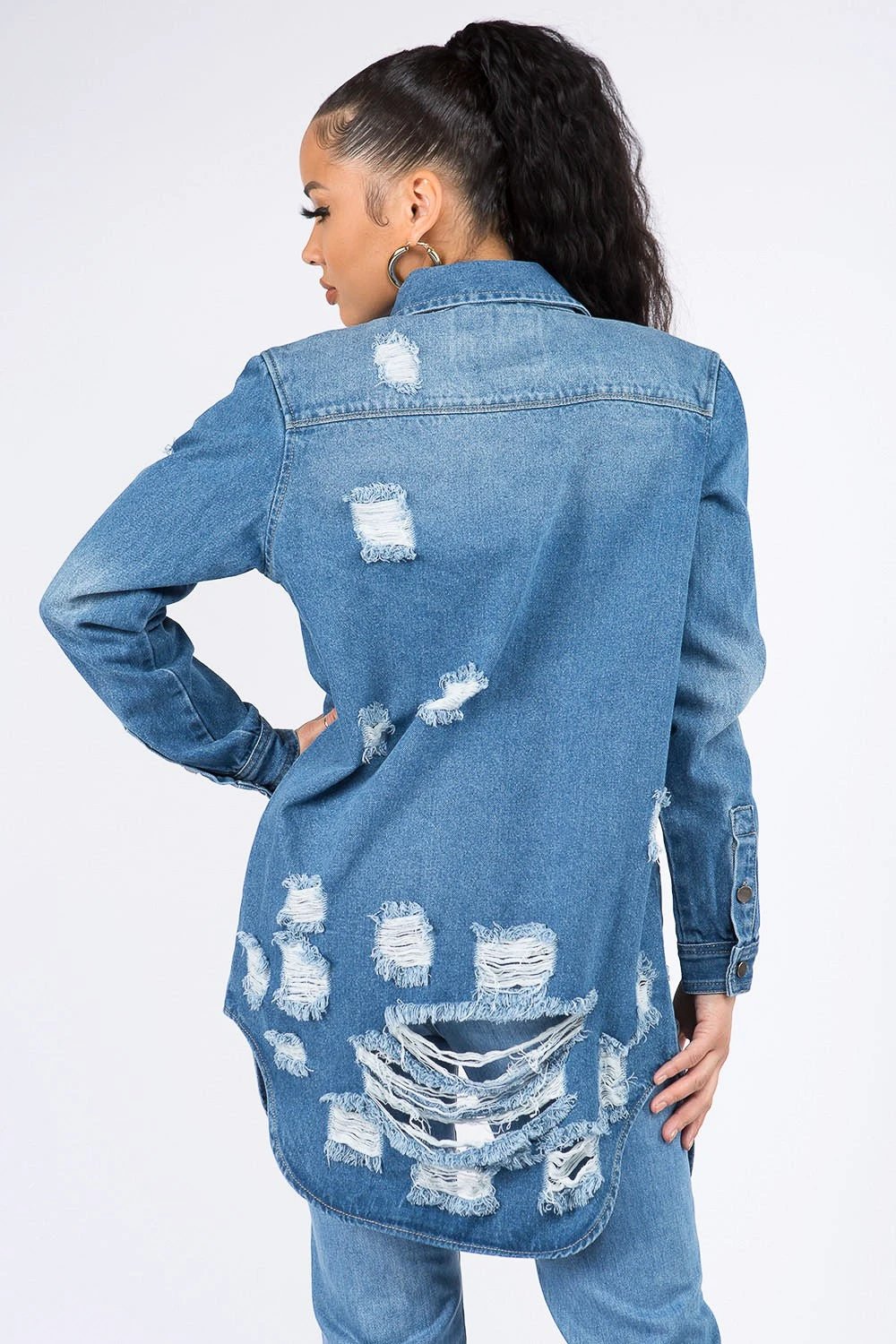 American Bazi Distressed Button Down Denim Shirt Jacket